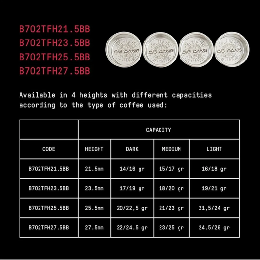 The IMS Big Bang filter baskets are available in four different heights, each with its own capacity depending on the roast type you use. This way, you can always choose the perfect basket for your espresso, whether you use a light, medium, or dark roast.